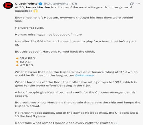 美媒Clutchpoints写道:36岁的哈登依旧是篮球界最顶尖的后卫之一,本赛季的哈登场均25.6分8.1助攻4.9篮板,当他在场时快船进攻效率达到117.9排在联盟第六,而当哈登下场时快船进攻效率下滑到103.1联盟倒数之一,哈登在场/不在场进攻效率差值高达14.8。